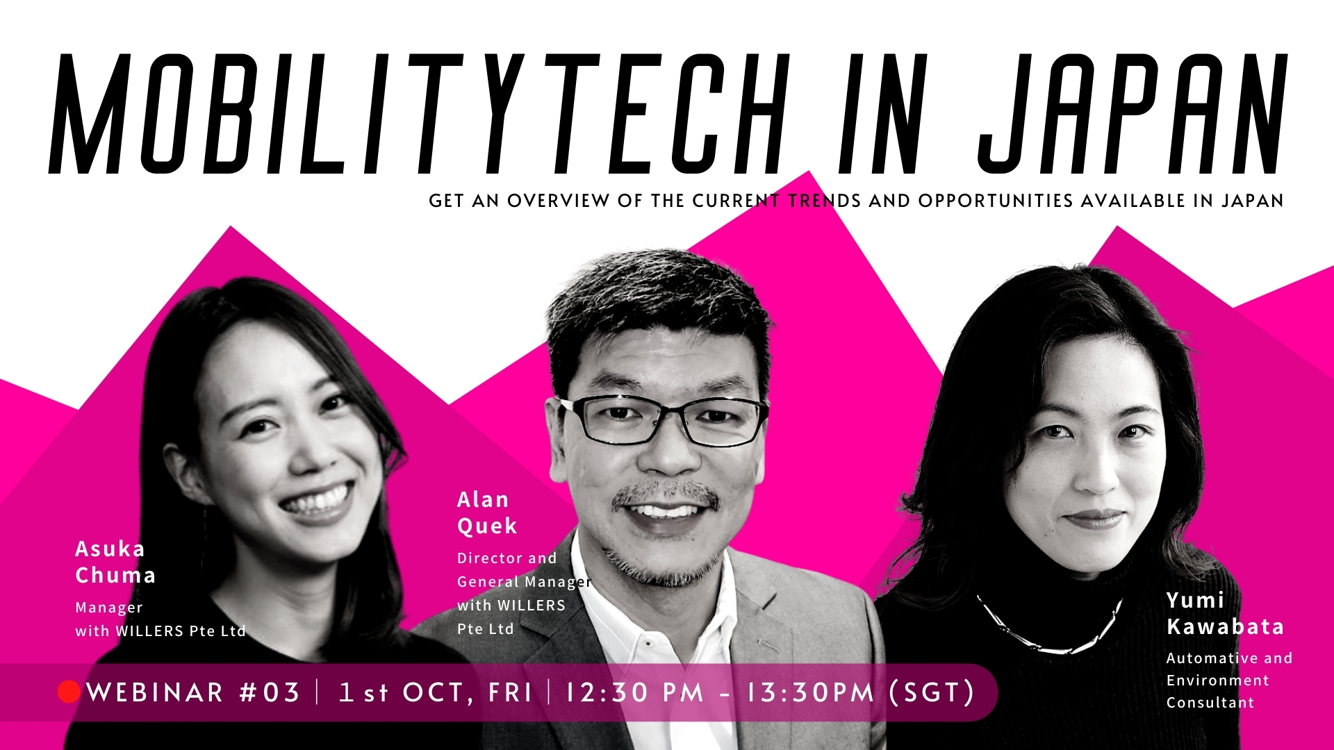 Join us in our third session where we explore what the Mobility Tech scene in Japan is currently like. Hear from Asuka Chuma (Manager) and Alan Quek (Director and General Manager) of WILLERS Pte. Ltd., as well as Automative and Environment Consultant, Yumi Kawabata, as they share with us how mobility has shaped and continues to shape transportation and movement in and around Japan.
