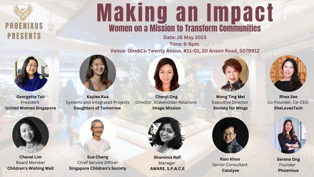 Georgette Tan Adamopoulos from United Women Singapore, Kaylee Kua from Daughters Of Tomorrow (DOT), Cheryl Ong-Tungka, MSID from Image Mission Ltd, Ting-Mei Wong from WINGS, Rhea See from She Loves Tech, Chanel Lim from Children’s Wishing Well, Sue Cheng from The Children’s Society, Shamima Rafi from AWARE and Rain K from Catalyse