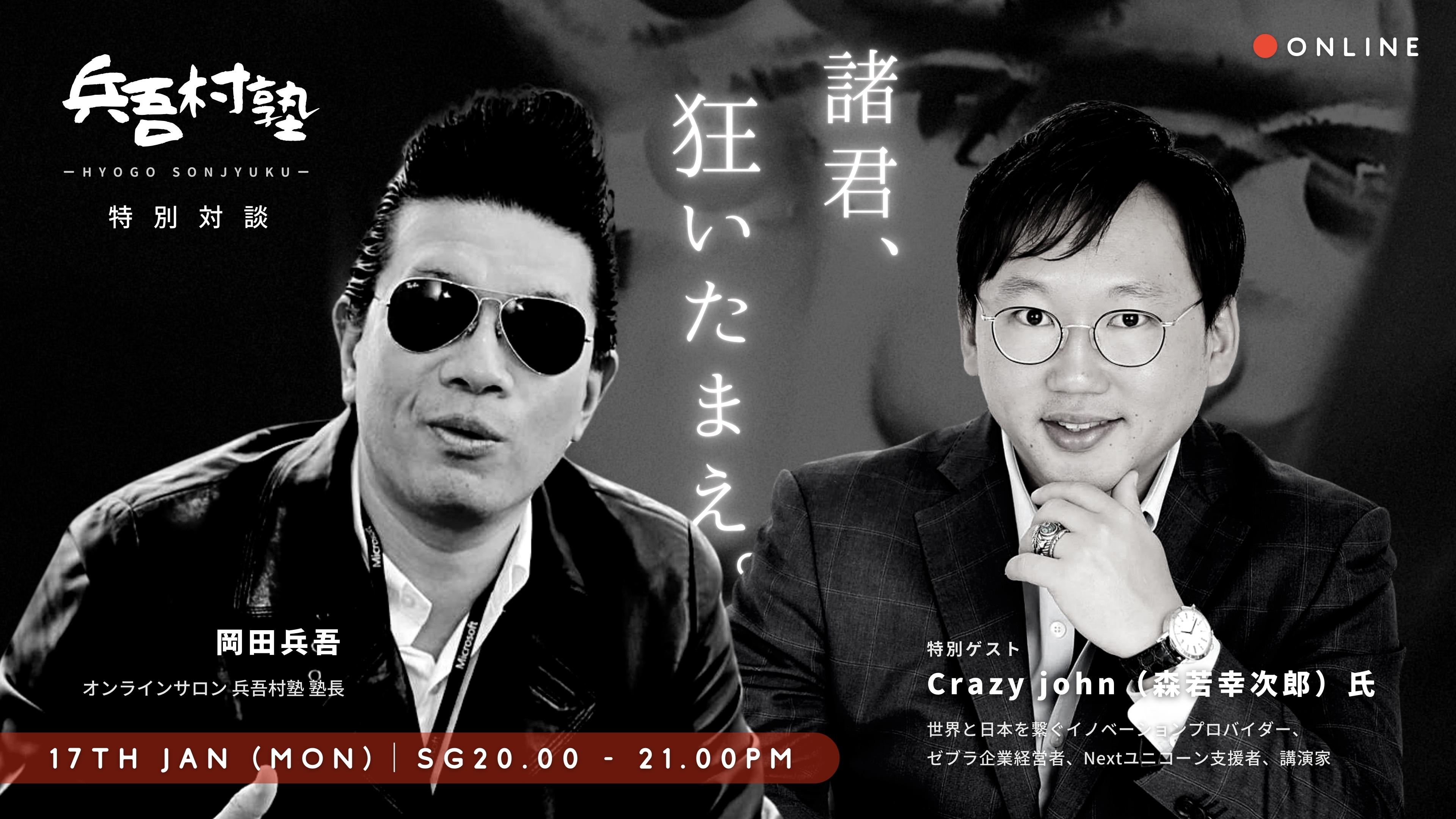 1月17日(月)シンガポール時間 20:00から、兵吾村塾 新年特別企画として、世界と日本をつなぐイノベーションプロバイダー森若幸次郎(Crazy John)さんをゲストにお迎えし、塾長( 岡田 兵吾 さん )と対談いたします。